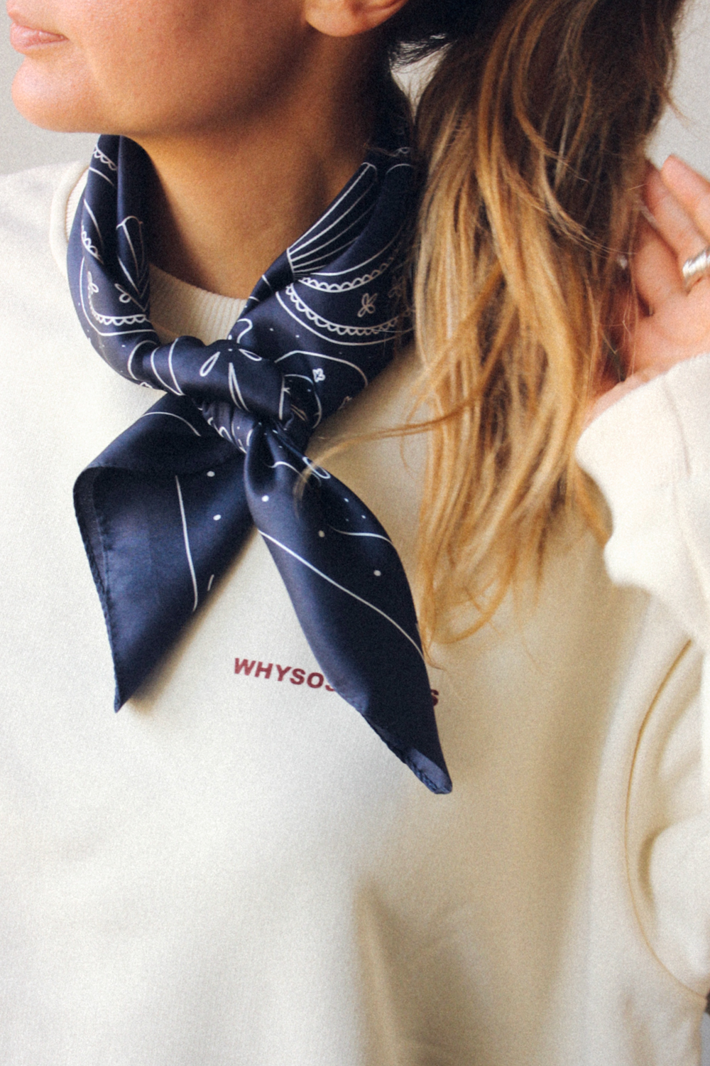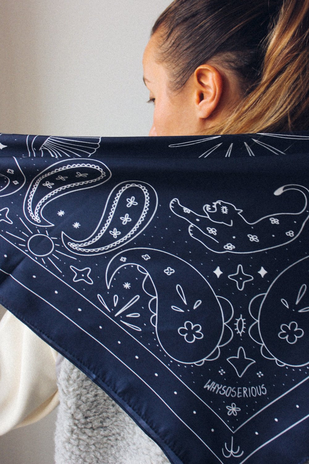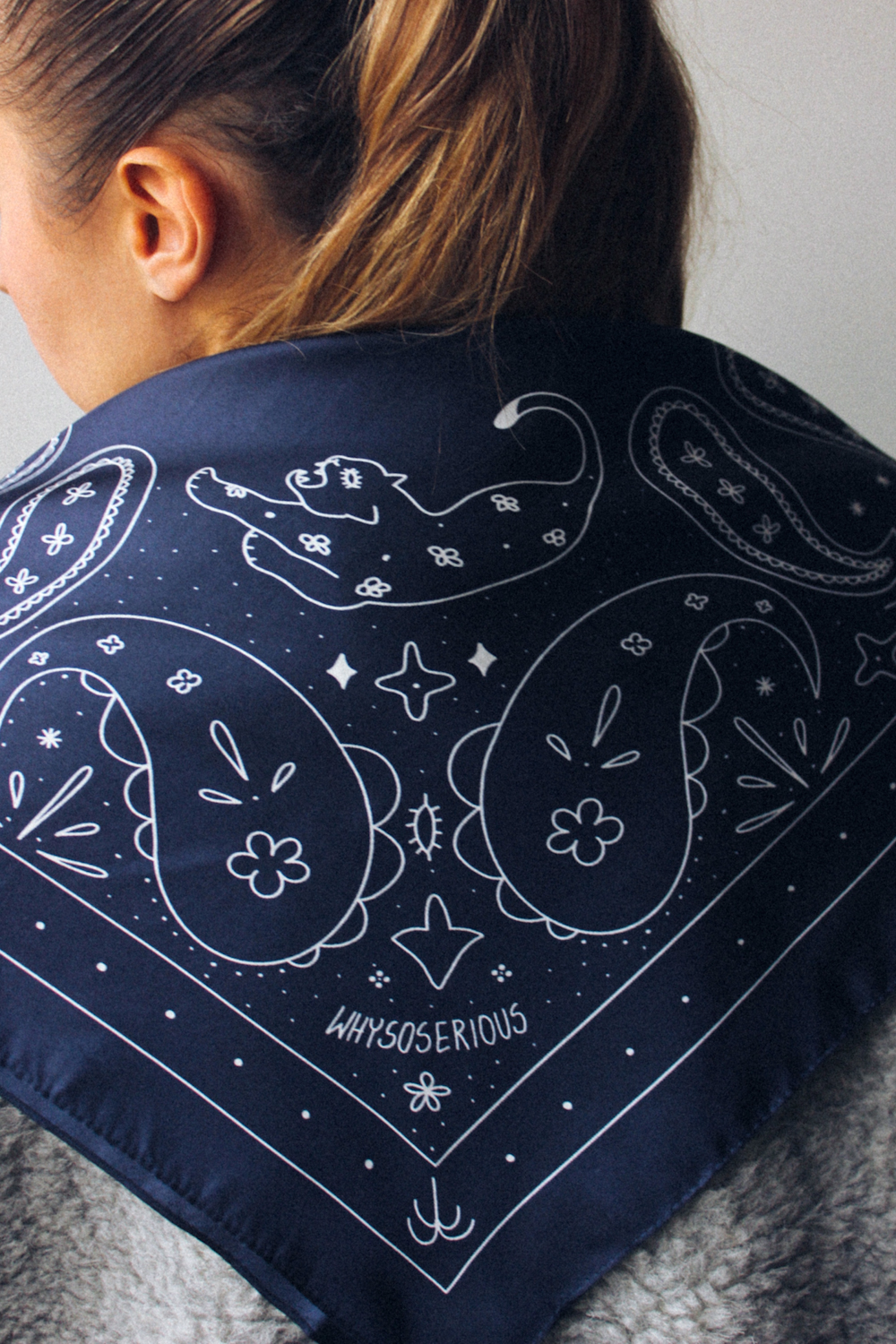Apaszka Tiger Dark Blue wykonana jest z najwyższej jakości 100% jedwabiu z autorskim printem WHYSOSERIOUS. Print jest miksem paisley oraz dodatkowych motywów takich jak tygrys czy Venus. Jedwabna apaszka w kolorze niebieskim to jakościowy klasyk, który nigdy nie wychodzi z mody, pasuje do wszystkiego i przede wszystkim sprawia, że czujesz się fantastycznie bez zbędnego wysiłku.