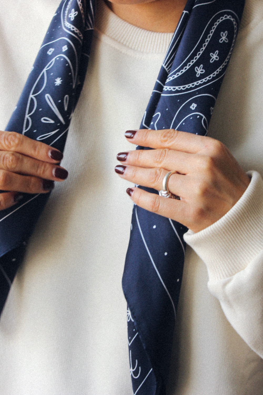 Apaszka została wykonana w lokalnym zakładzie w Polsce, od lat produkującym akcesoria z jedwabiu. Apaszka ma wykończenie z bardzo subtelnym połyskiem.
