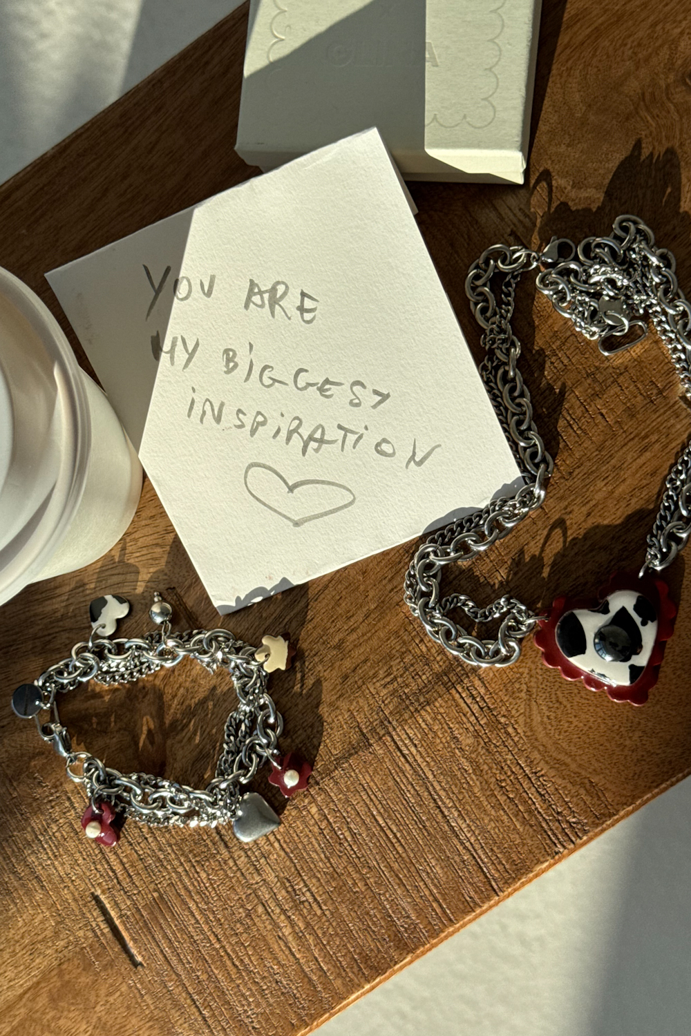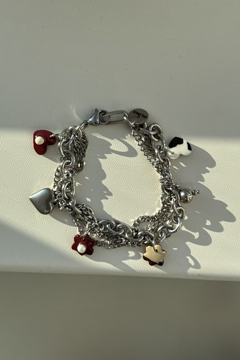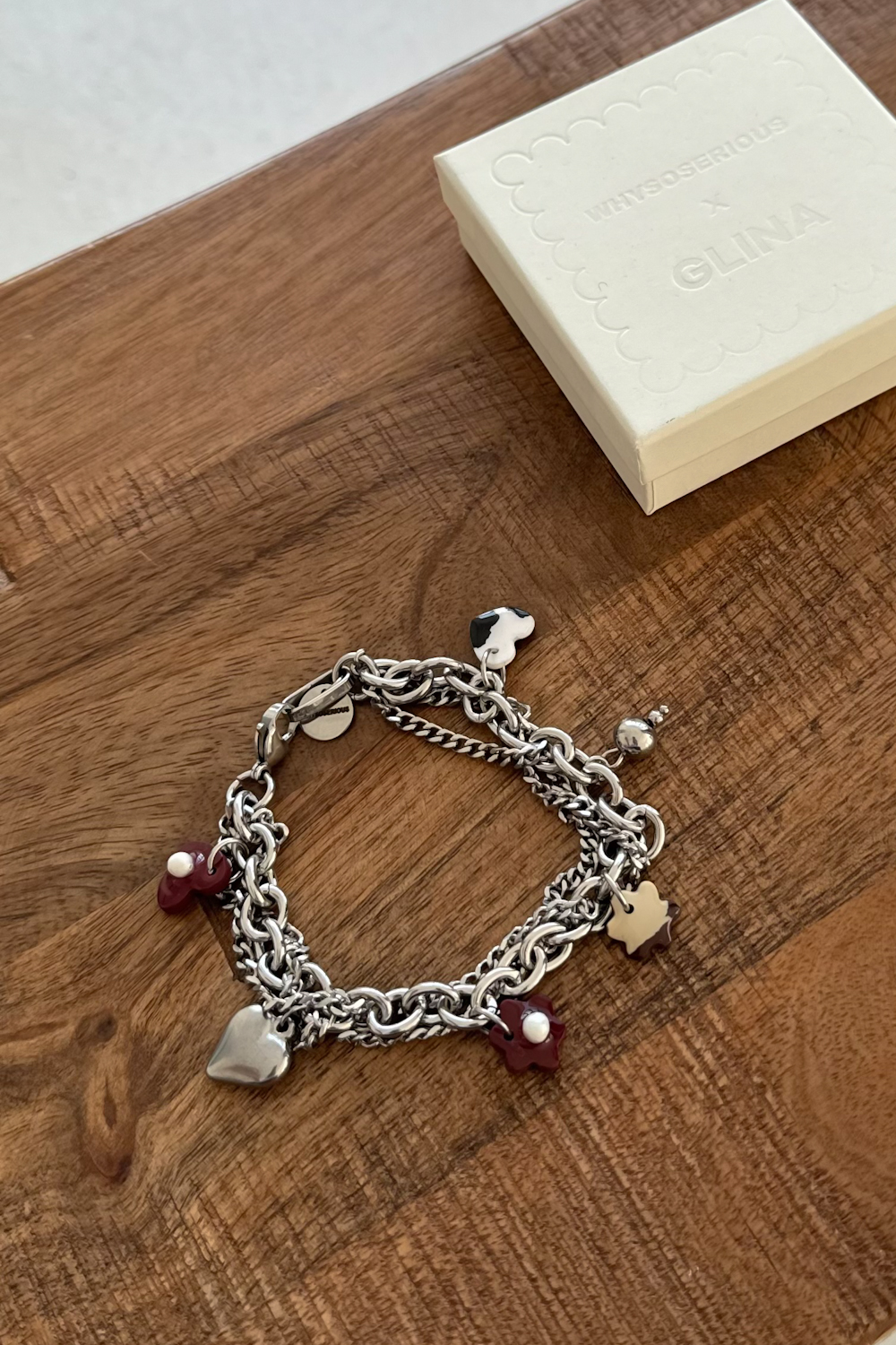 Love Notes GLINA x WSS to wyjątkowa bransoletka wykonana z łańcuszków z zawieszkami – wynik naszej kolaboracji z jedną z naszych ulubionych lokalnych marek biżuterii Glina Store.