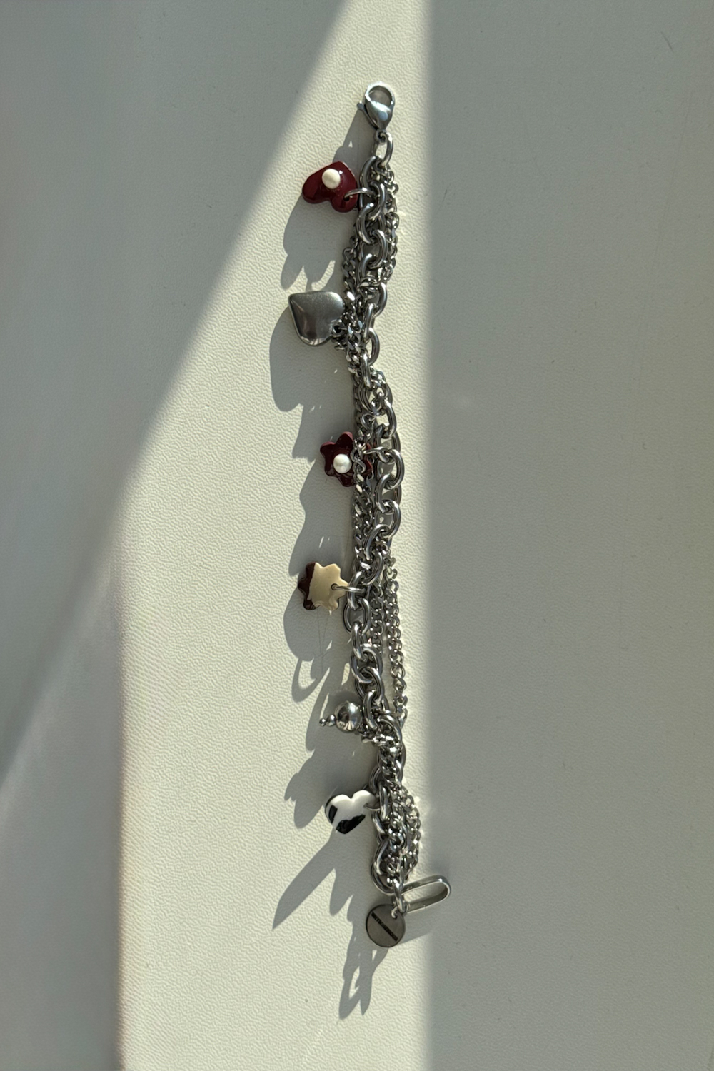 Każdy detal tej bransoletki został starannie dopracowany — od przeplatanych łańcuszków z antyalergicznej stali nierdzewnej, po ręcznie wykonane zawieszki z glina polimerowy i naturalnych perełek.