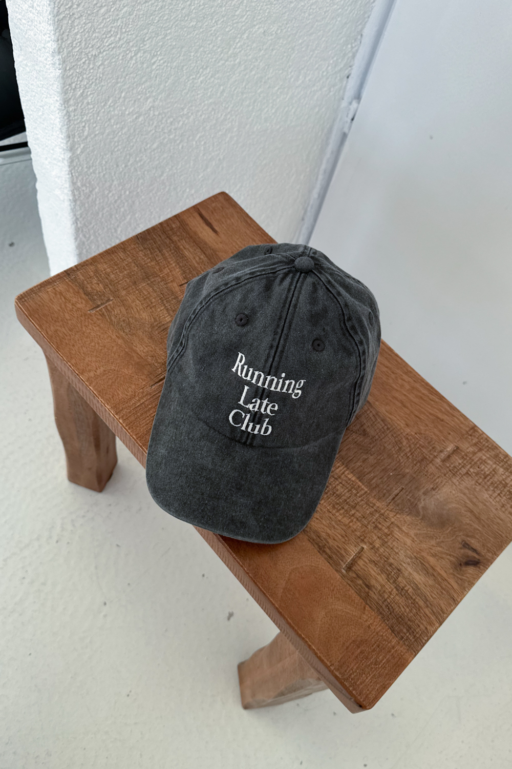 Czapka z daszkiem unisex w kolorze vintage black z efektem sprania. Z przodu czapki haft Running Late Club w kolorze ecru. Ta ciemno szara czapka z daszkiem z idealnie kontrastującym haftem to nieodłączny element każdego wyjazdu, luźnego outfitu i porannego biegania. Sprany czarny kolor tej czapki to niezawodny wybór, który harmonizuje z różnymi stylizacjami i jest wspaniałym wyborem na każdą okazję. Idealna na kawę z koleżanką, nawet jeśli ciut spóźnioną. Nasza 6-panelowa konstrukcja nadaje czapce oldschoolowy look.
