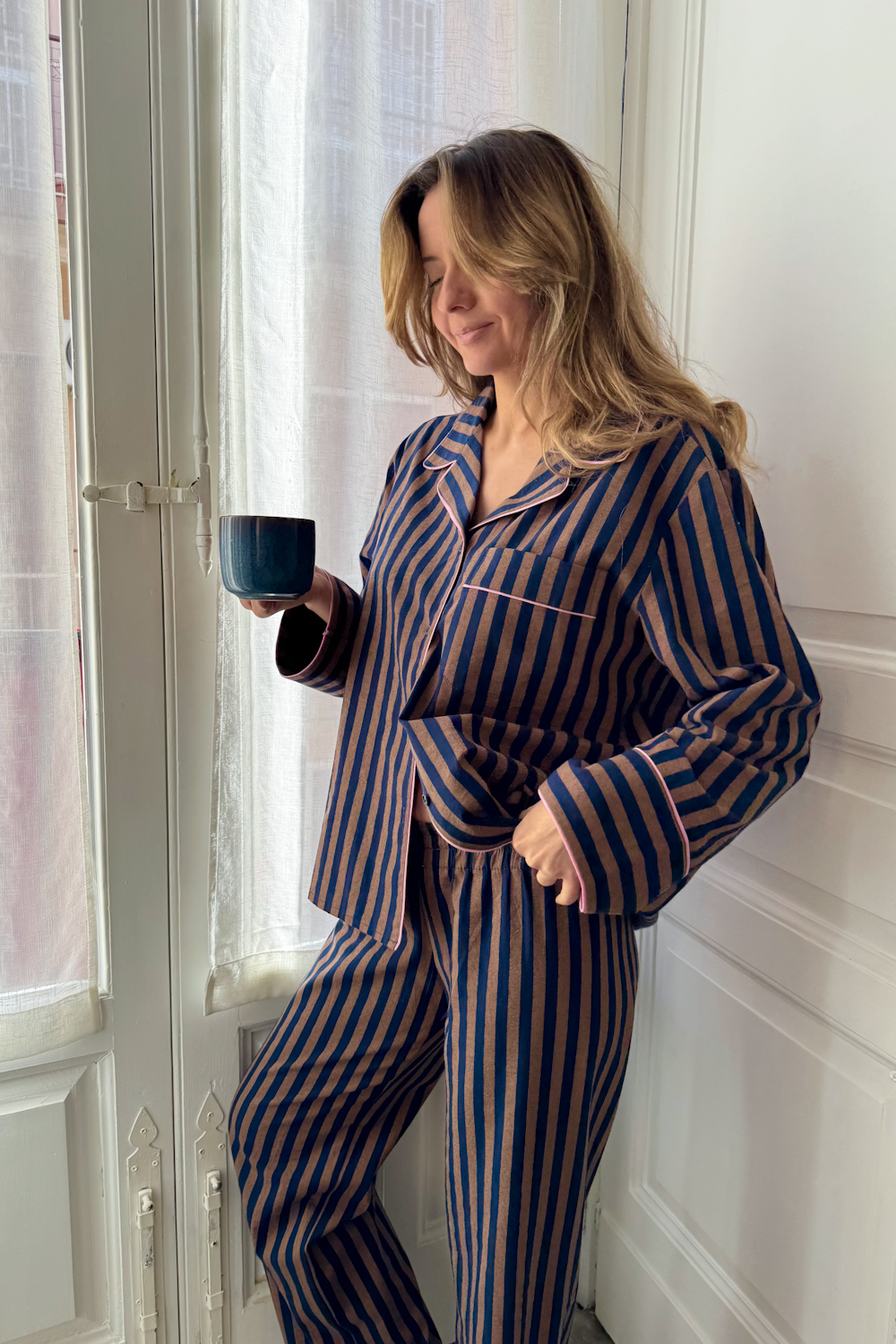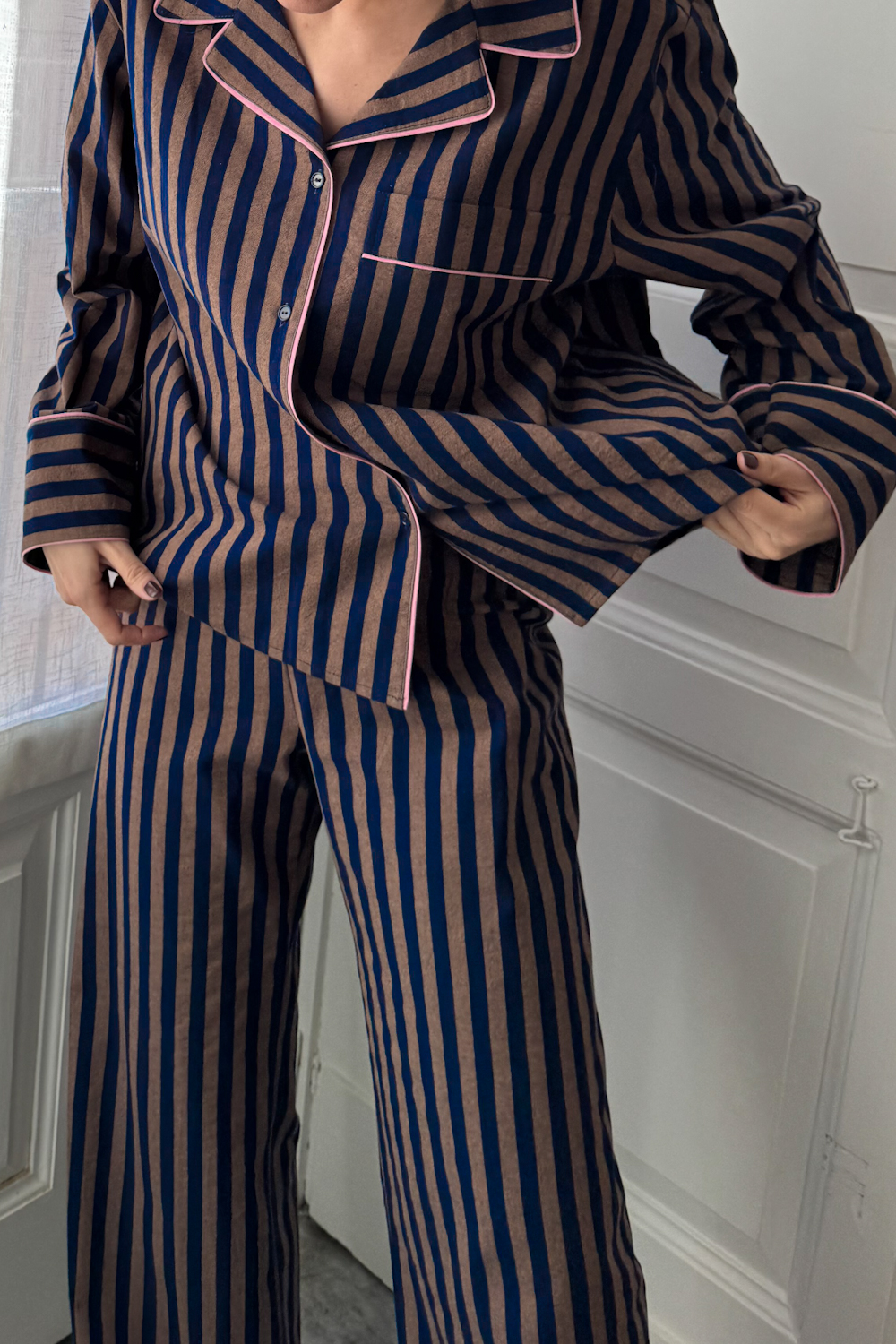 Trousers Mornings w paski o kolorach chocolate-navy to 100% bawełniane spodnie piżamowe, nasz nowy must have na powolne poranki i wieczory filmowe.