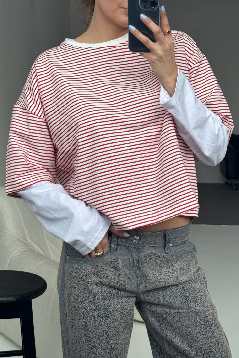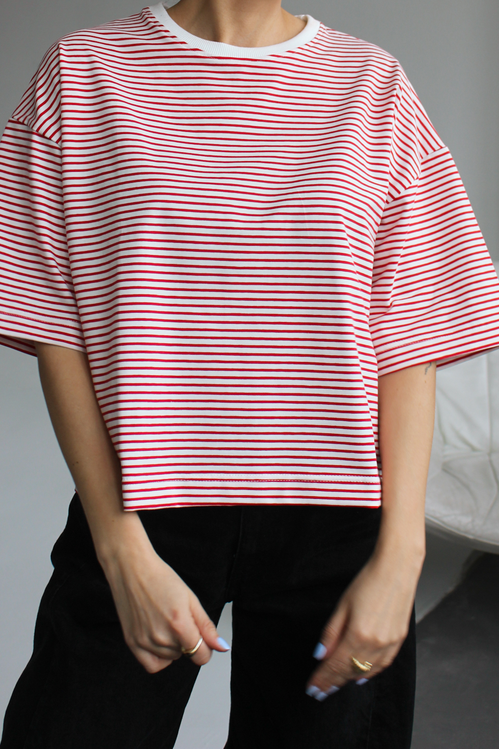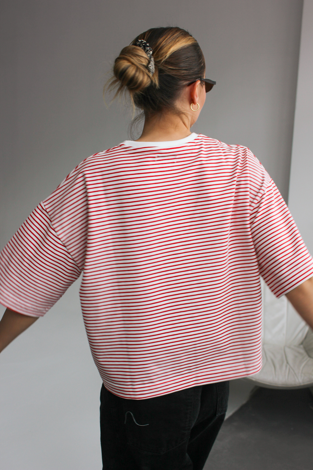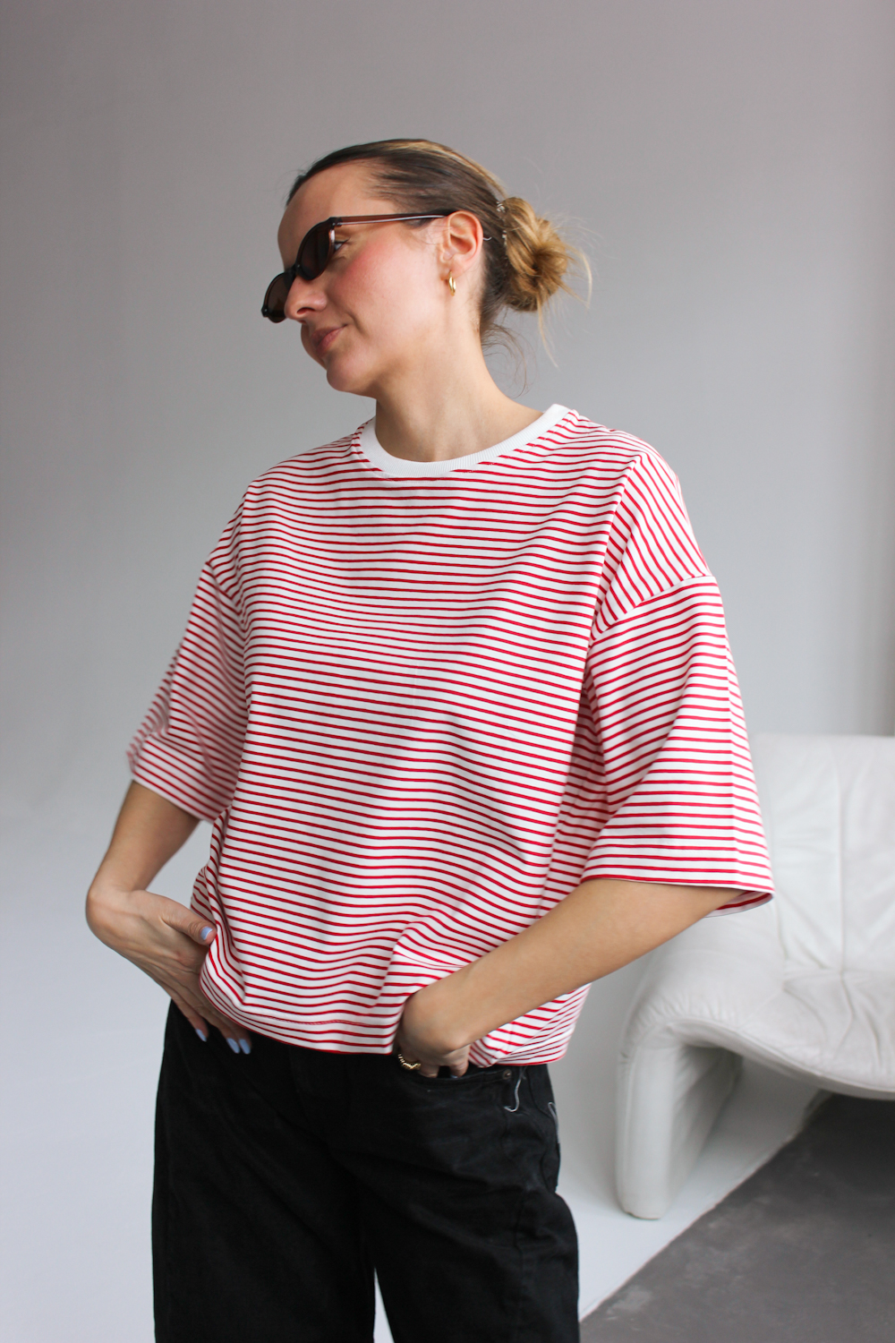 T-shirt Boxy Stripes Red in cotton with finishing premium is a timeless classic in stripes with a unique red colour. Designed for those who appreciate quality but also unique style. We worked on it for a very long time so that this boxy t-shirt is just what you are looking for: comfortable, light oversize, made of thicker, soft material and suitable for any outfit. The cut of this t-shirt will leave you feeling casual and comfortable, whether you're planning a weekend getaway or need a decent basic t-shirt for work.