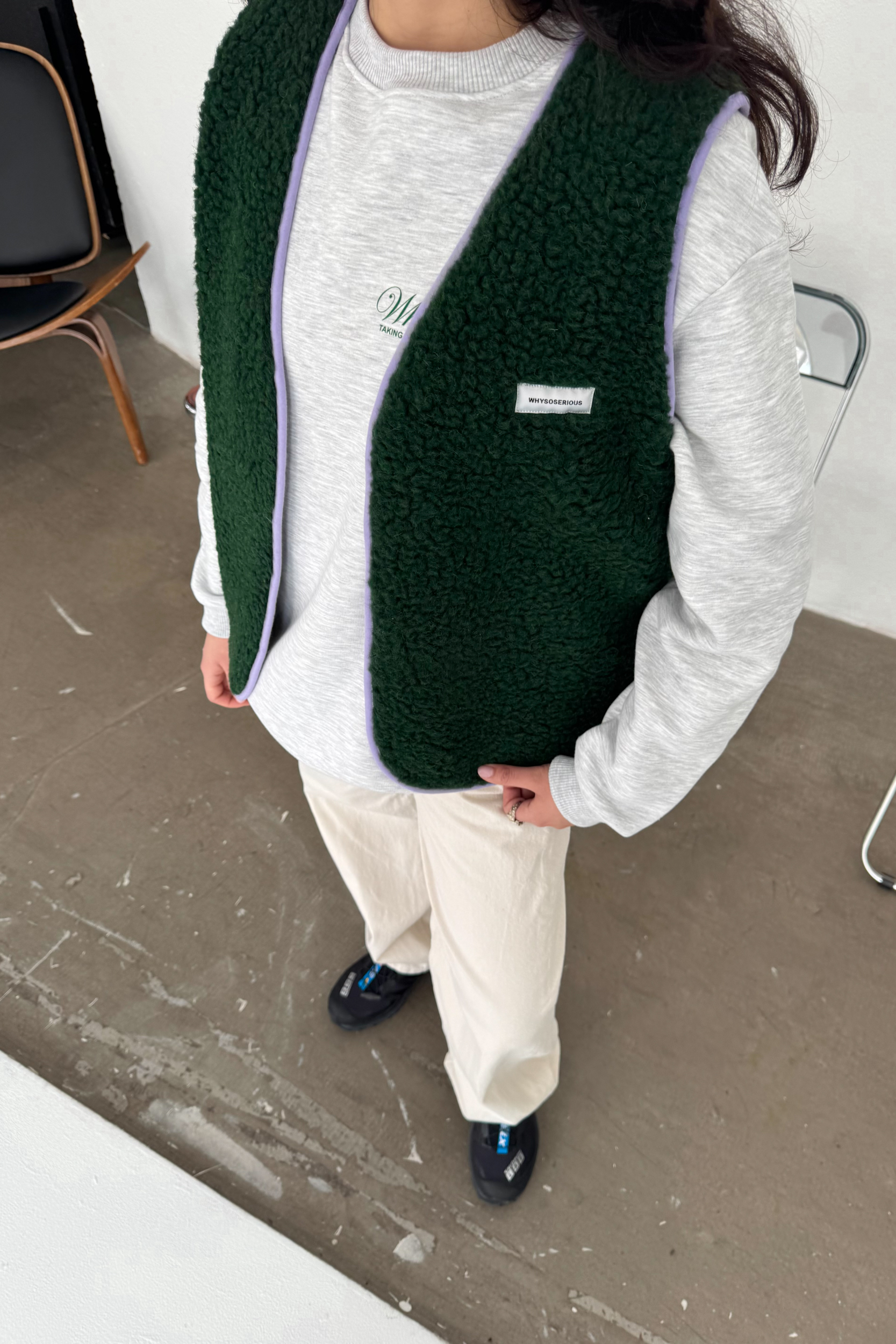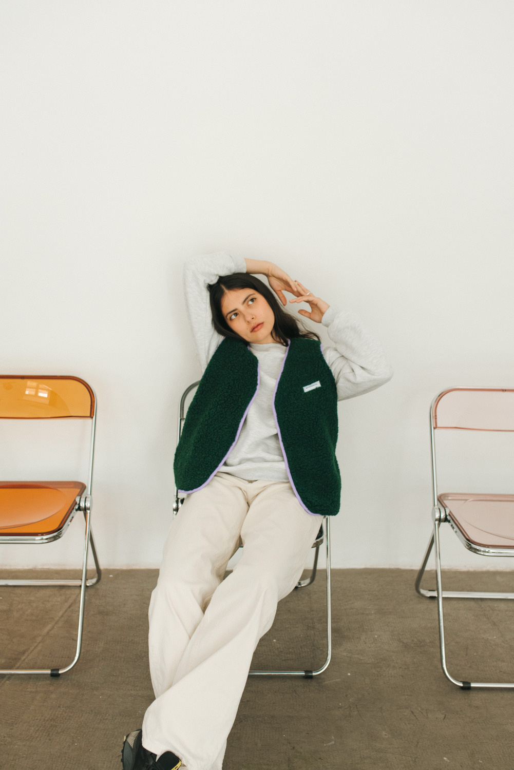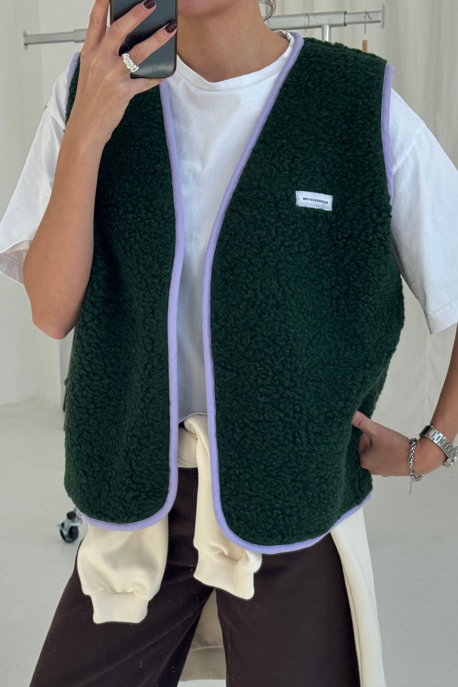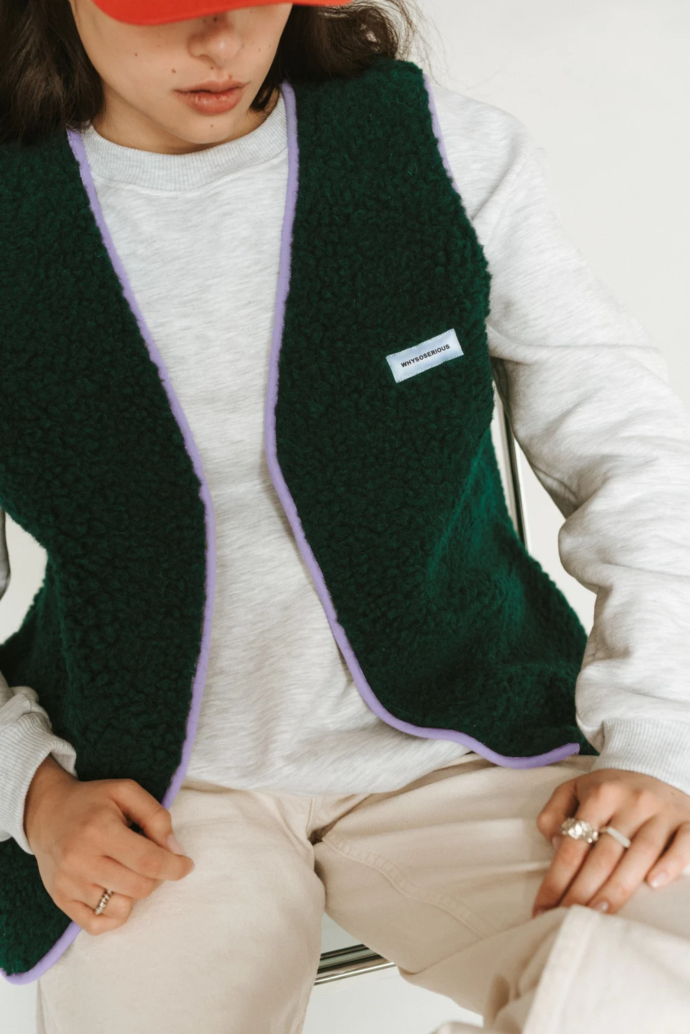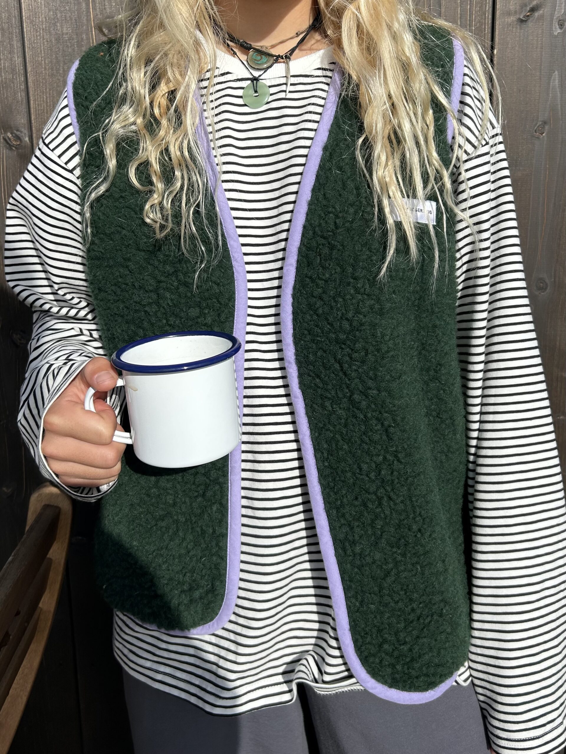 Ciemnozielona kamizelka z wełny merino w kolorze Forest Green to ukłon w stronę miejskiego stylu z twistem natury. Idealna dla tych, którzy lubią warstwowe stylizacje, cenią sobie jakość premium i… nie boją się kolorów! Fioletowy akcent dodaje charakteru i subtelnego kontrastu, który wyróżnia kamizelkę na tle klasycznych fasonów. Zakładasz ją na bluzę, sweter, longsleeve albo bezpośrednio na T-shirt – i jesteś gotowy_a na spacer, kawę z przyjaciółką albo spontaniczny wypad za miasto.