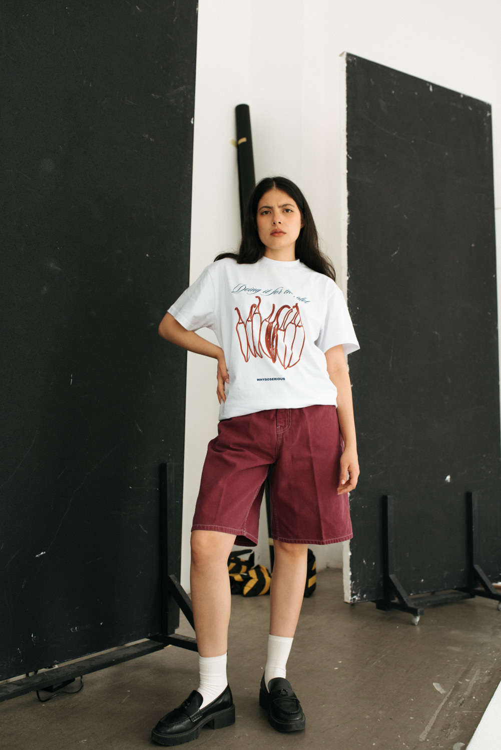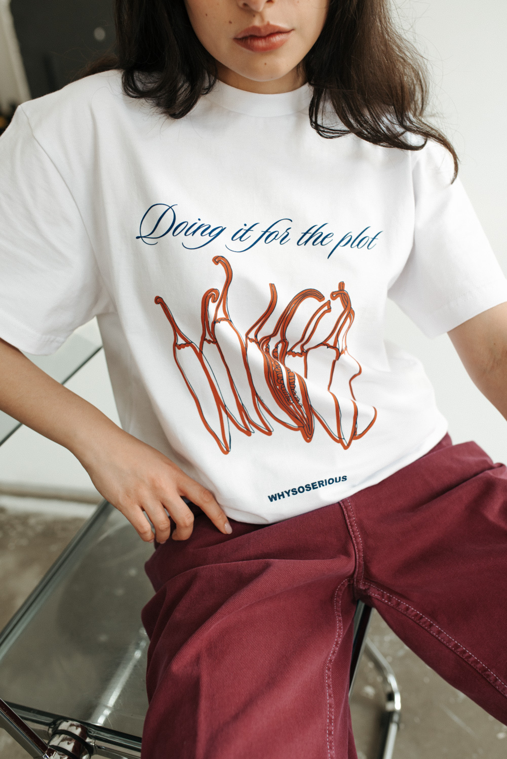 Biały T-shirt Doing it for the plot z grubej bawełny, to połączenie klasycznego stylu z charakterem. Prosty fason, śnieżno biały odcień koszulki i przewrotny nadruk z papryczkami chilli tworzą zestaw, który przyciąga uwagę i tworzy centrum każdej stylizacji. To koszulka dla tych, którzy lubią, gdy codzienność ma swój własny scenariusz – najlepiej z nieoczywistym zwrotem akcji.