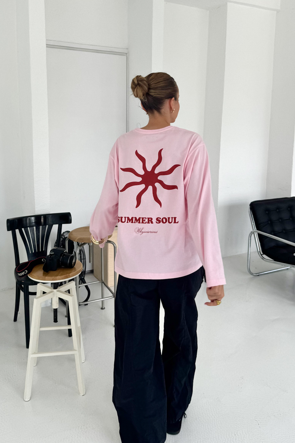 Z przodu i z tyłu kontrastowy nadruk z czerwonym słońcem Summer Soul — to subtelne przypomnienie, że lato to nie tylko pora roku, ale vibe, który możesz mieć ze sobą wszędzie. Prosty krój i wydłużony rękaw sprawiają, że sprawdzi się zarówno w codziennych, jak i bardziej stylizowanych zestawieniach.