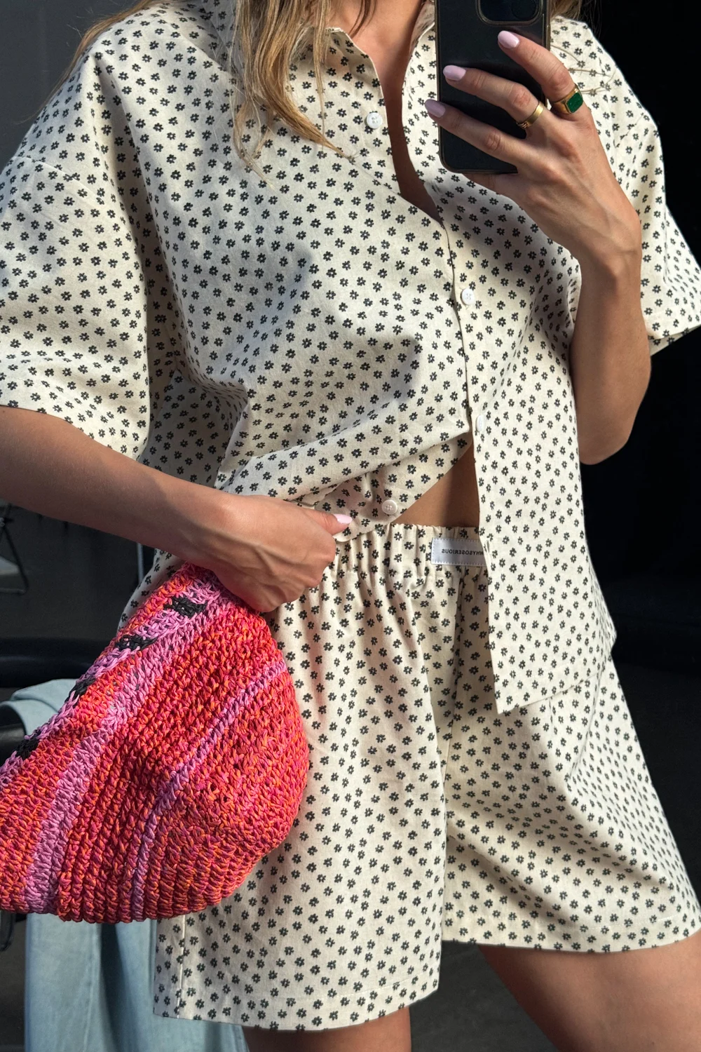 Klasyczny krój z lekko luźniejszą nogawką i elastycznym pasem sprawia, że szorty dopasowują się do Ciebie — nie odwrotnie. A jeśli chodzi o kolor? Jasny beż w połączeniu z printem w kwiatki to mix, który automatycznie dodaje Ci +10 do letniego nastroju.