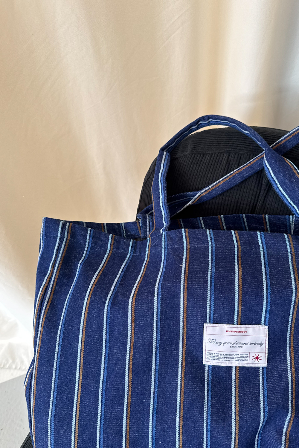 Odcień granatu idealnie komponuje się z cienkimi wyszywanymi paskami oraz naszą metką Take Your Pleasures Seriously. Torba posiada z boku dwie dodatkowe przegródki i wygodne uchwyty, dzięki którym założysz ją swobodnie na ramię.